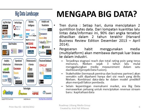 Meskipun demikian, sebagai tools dan resources yang menghasilkan data dan informasi baru, masih ada banyak pekerjaan rumah terkait Big Data. Teknik bagaimana menangkap, membersihkan, menganalisis kelimpahan data tersebut menjadi informasi yang berguna bagi kepentingan perencanaan dan evaluasi.