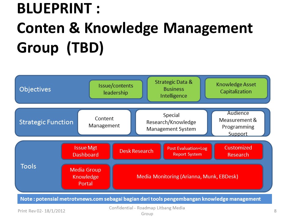 Proposal untuk Metro TV sekaligus hipotesis dalam menghadapi perubahan lanskap itu bernama “Content & Knowledge Management”. Fenomena perubahan industri ini menuntut 3 hal. Pertama, perubahan kultur. Kedua, perubahan model bisnis. Ketiga, perubahan pengukuran. Kita mulai satu per satu.