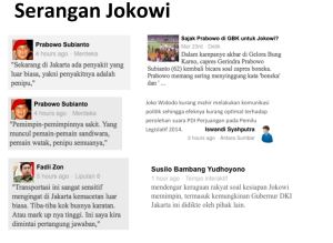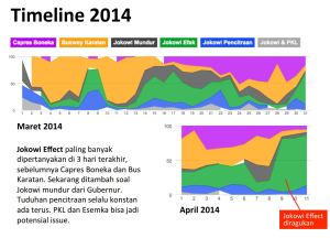 Tentu saja bagi lawan politik, kegagalan PDIP ini seolah menjadi bukti bahwa Jokowi bisa dikalahkan. Saat itu bersama dua kawan karib, Kiki Taher dan Putra Nababan, membentuk sebuah unit kecil bernama Suropati yang memang didisain untuk memantau perkembangan eskalasi politik sejak 2013, kami mencatat dari berbagai data mulai dari pelibatan big data analytic, intelijen media, behavioral research sampai survei politik bahwa serangan ke Jokowi ini akan berhasil jika issue cukup besar, influencers credible, media mendukung dan dilakukan secara kontinu. Dan sejak 9 april atau paska gagalnya PDIP meraih suara di atas 20% serangan makin tajam seperti yang bisa dilihat dalam grafis rekaman pola pergerakan isu dalam timeline 2014.