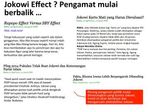 Selain meragukan kehebatan Jokowi Effect, isu besar yang diluncurkan adalah Capres Boneka selain isu soal korupsi pengadaan bus trans Jakarta hingga isu terkait pencitraan mobil esmeka. Dari kajian cermat terhadap berbagai data dan eskalasinya dari hari ke hari dapat disimpulkan dari kesemua peluru yang mengarah ke capres Jokowi yang paling tajam adalah Capres Boneka dan tidak adanya Jokowi Effect.