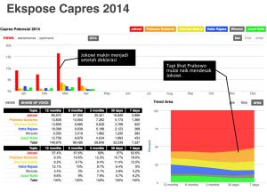 Untuk pertama kalinya tingginya eksposur serta elektabilitas Jokowi saat dideklarasikan sebagai capres (bahkan beberapa pengamat politik ada yang mengatakan sudah pasti Jokowi menang telak dalam pemilu presiden karena tingkat elektabilitas yang jauh di atas 50%), ada indikasi patahnya trend positif Jokowi dalam kajian perkembangan data kami. Dari sederet nama kandidat waktu itu, penurunan signifikan Jokowi dalam trend 7 hari yang diamati, diikuti dengan peningkatan cukup tajam dari kandidat Prabowo Subianto dari sisi ekspos capres baik dari rekaman pemberitaan media mainstream maupun percakapan media sosial.