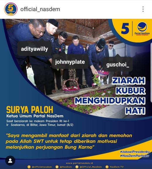 Di saat banyak “ulama” di media massa hobi mengumbar sikap anti toleransi, membid’ahkan tradisi kultural seperti shalawatan-tahlilan-manakiban dan ziarah. Surya Paloh justru melakukan sebaliknya, merayakan tradisi keagamaan tersebut. NU banget ini orang, batin saya.